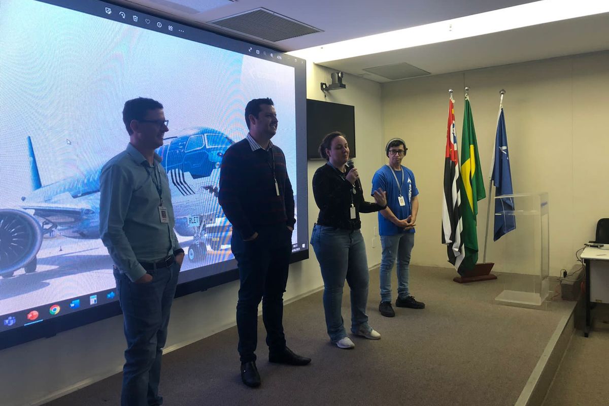 Voluntários(as) Embraer apaixonados pela Indústria Aeronáutica apresentam a Empresa e suas atividades para estudantes dos Colégios Embraer e outras instituições