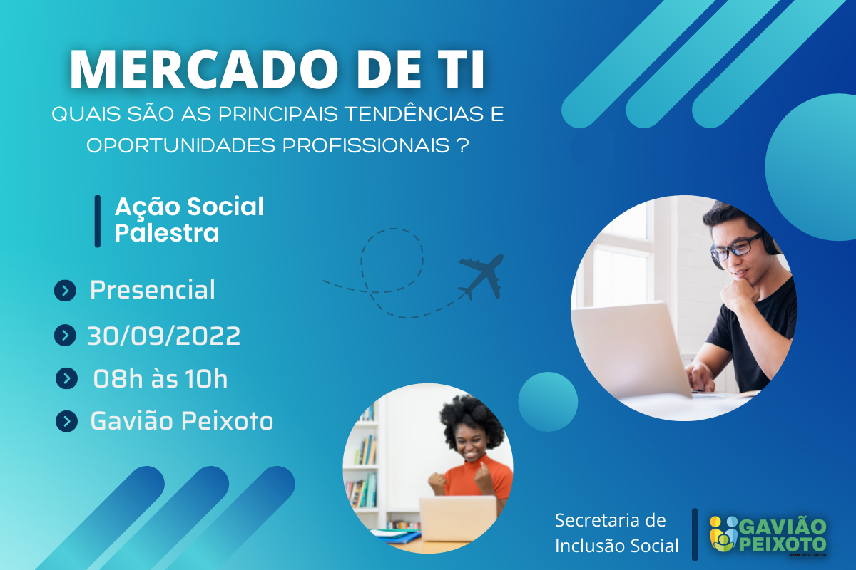 A ação tem como proposta a realização de uma palestra aos alunos do ensino médio da Escola Estadual “EE Conselheiro” sobre as principais tendências e oportunidades profissionais do mercado da TI.A demandas por profissionais competentes que possam atuar no mercado de TI está crescendo cada vez mais. Isso porque a tecnologia está imersa tanto no local de trabalho, quanto em casa, nos momentos de negociação e lazer. Além disso, o mercado de TI é uma área aquecida e verdadeiramente promissora no município de Gavião Peixoto, ele se faz presente através da unidade industrial da Embraer que respira inovação.